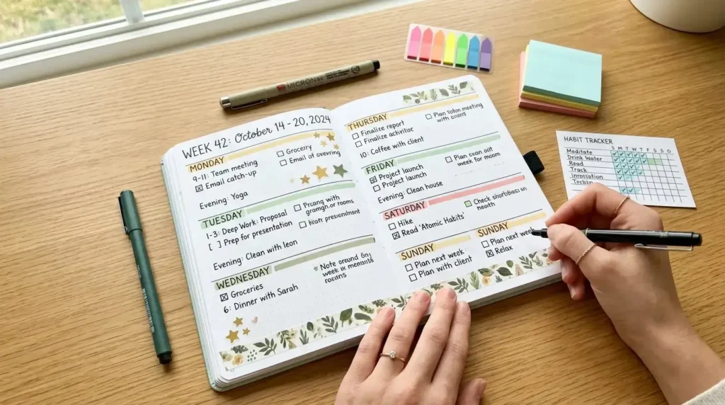 - Review your week every Sunday. A five-minute weekly check-in asking “What worked? What got skipped? What do I want to change?” gives you self-awareness that compounds over time. Most people fail the same way every week without ever noticing the pattern because they never stop to look.
